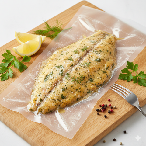 Chaque filet, pesant entre 120 et 140 grammes, est délicatement préparé "à la meunière", enrobé d'une fine panure légère et parfumée aux herbes, qui dore à la perfection lors de la cuisson. Sa chair blanche et fondante vous promet une expérience gustative exquise et légère.